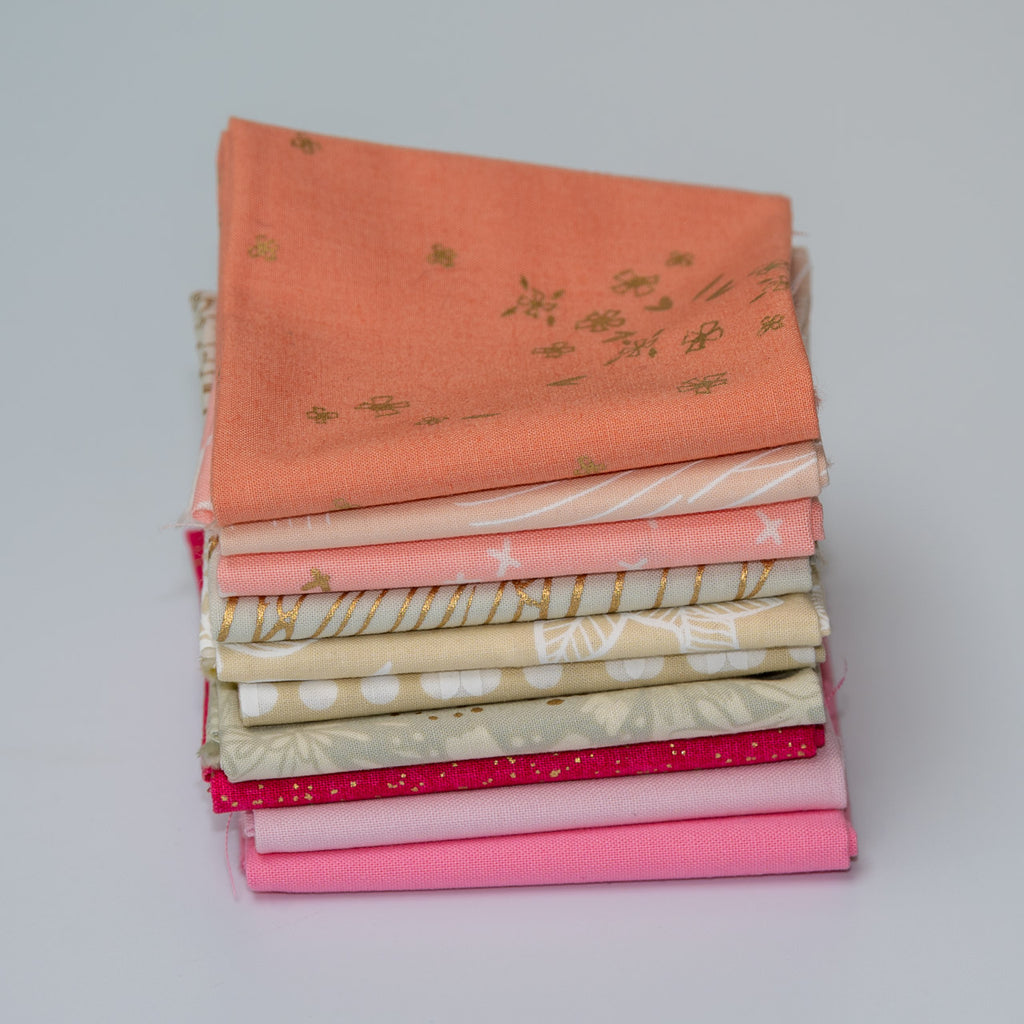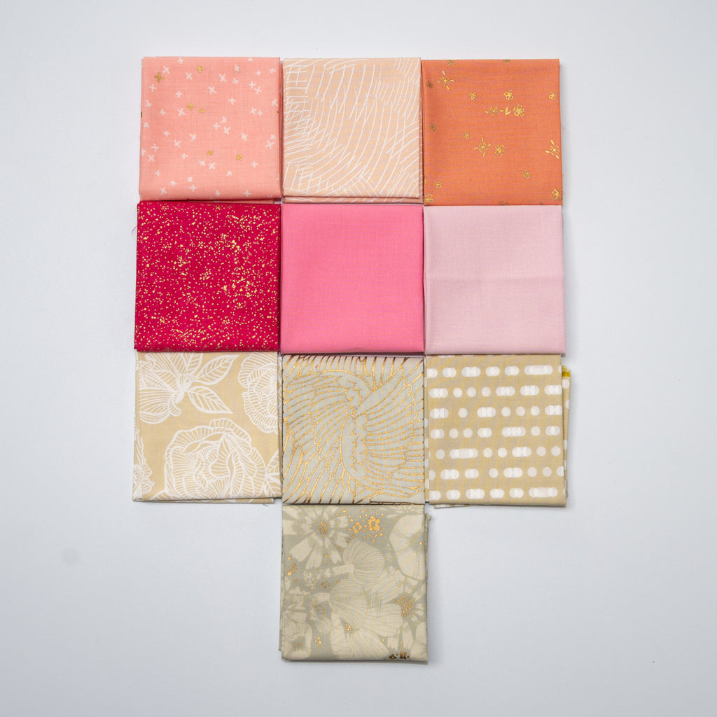 This collection includes coral, peach, pink, creams, grey and some with gold highlights with fabrics coming from Ruby Star, Makower and Moda