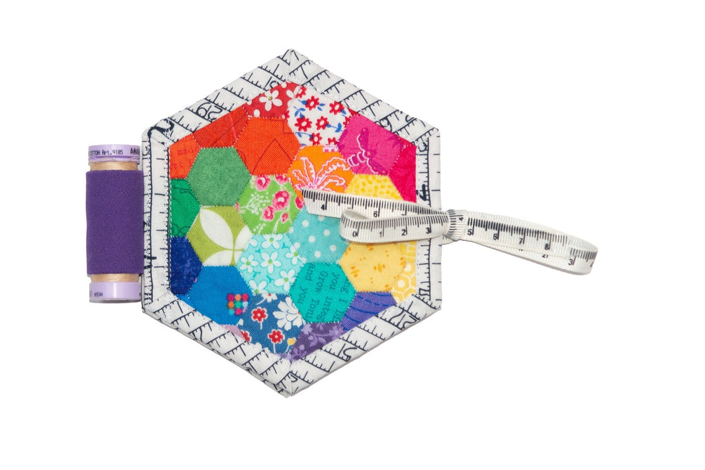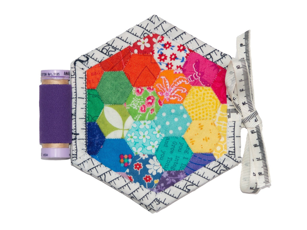 My mini sewing kit is 'sew' cute and practical (you will need the 2 1/2" Hexagon 'QAYG' template to be able to make this), it's small enough to keep in your bag to be ready to sew on the go. You are able to keep your scissors, thread, needles and pins together and they make wonderful presents.