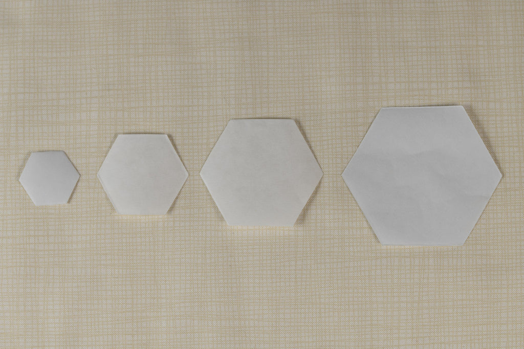 40 x freezer paper hexagons 1 1/4" in size (this is the length of an outside edge). Ready for you to use on your projects, just iron the shiny side of the paper to the wrong side of your fabric, and your ready to go, no need for pins, and don't forget that these are reusable until the stick goes so don't throw them away when finished.