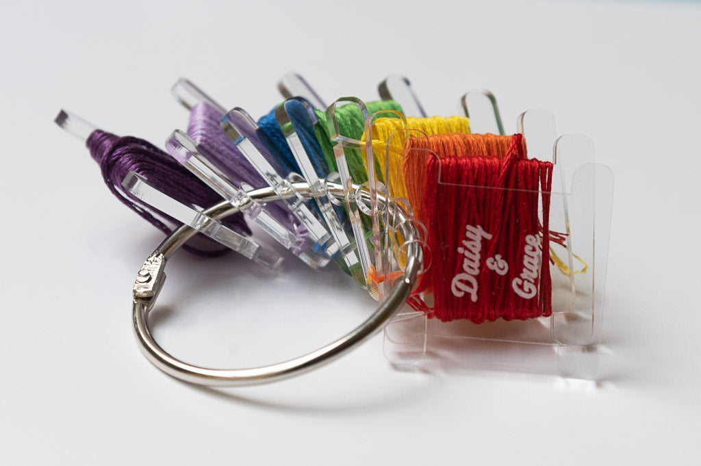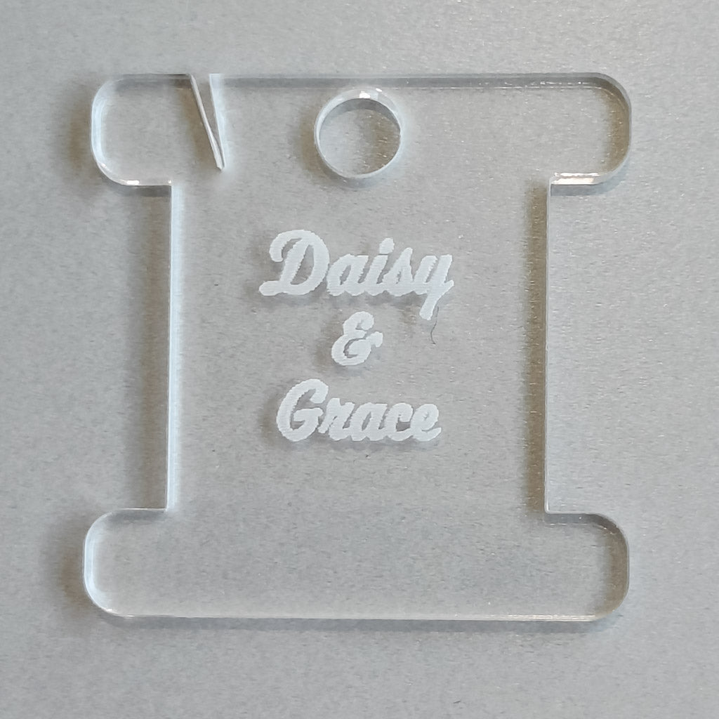 These bobbins are make from clear 3mm acrylic, they are 40mm by 40mm in size.