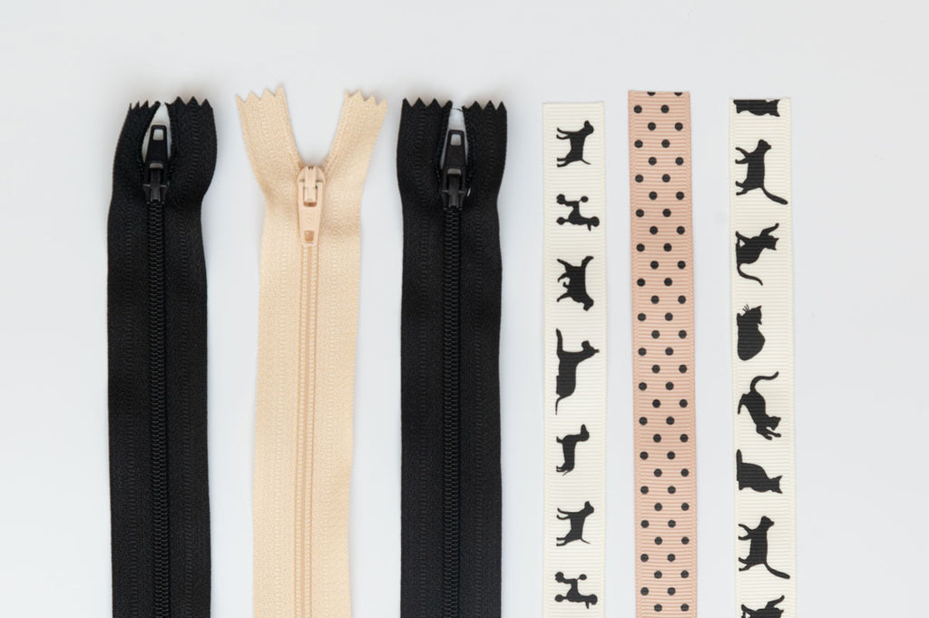 This set contains 1 x black zip, 1 x white zip, 1 x grey zip, inches on beige background, white star on black background and grey leaf design on white background ribbon and enough plastic fabric to make 3 pockets as well as the pattern.
