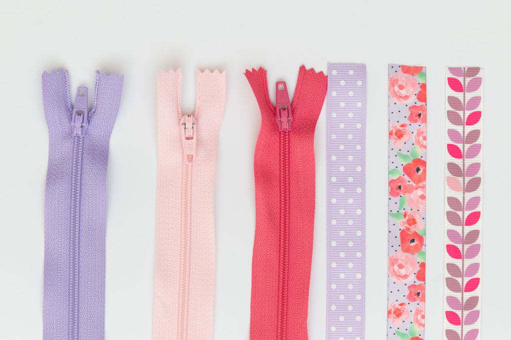 This set contains 1 x lilac zip, 1 x pale pink zip, 1 x bright pink zip, pink leaf design, lilac polka dots, and lilac floral ribbon and enough plastic fabric to make 3 pockets as well as the pattern.