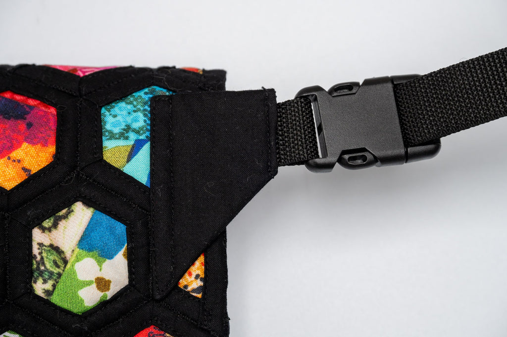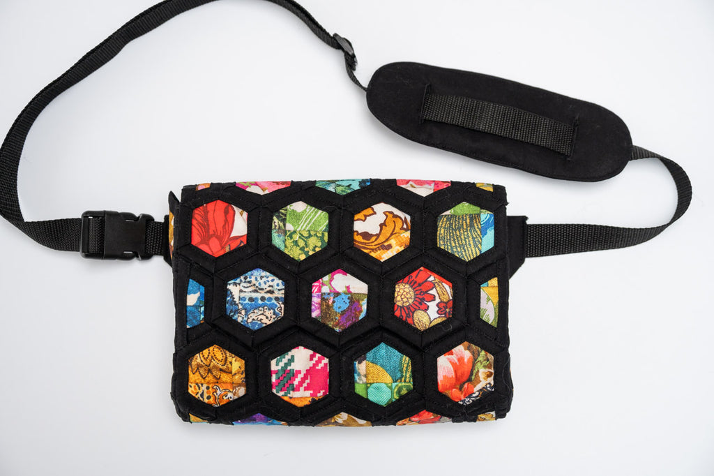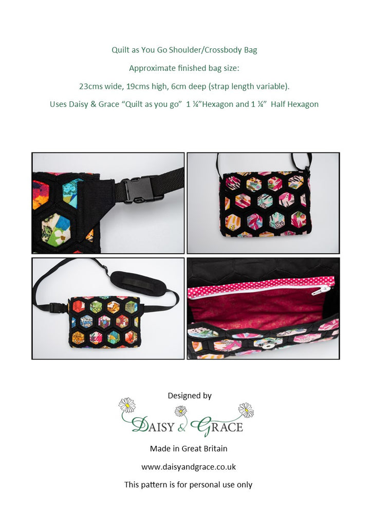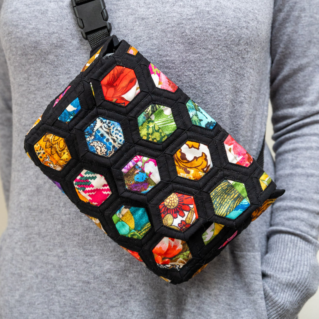 This is the Kit to make either a shoulder bag or the crossbody bag, it is in the amazing fabric by Moda called Vitage Soul, it is a multicoloured square print fabric but once cut into the hexagons it gives a great variety of images so I think that no 2 bags will look identical, all lined in Makower Plain Black cotton (Wadding is not included).